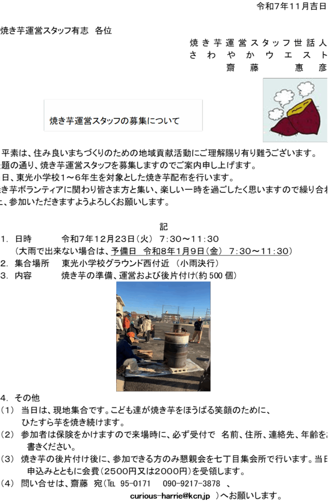 早朝より30名のボランティアによって500個の焼き芋が無事に11時30分に出来上がり、生徒さん全員に美味しく食べて貰いました。後片付けをし光台七丁目集会所でおでんと鍋料理で反省会を行いました。ご苦労様でした。ありがとうございました。齋藤惠彦